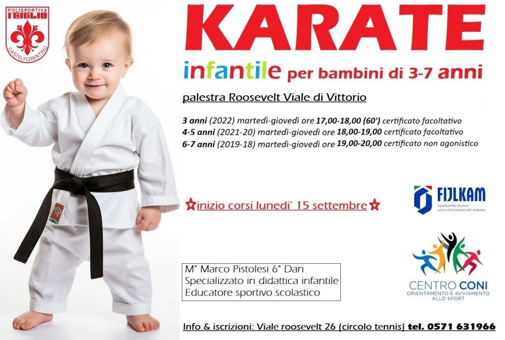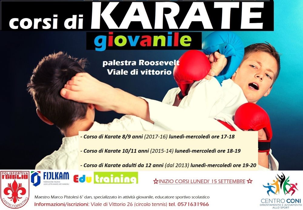 Il settore karate nasce a Castelfiorentino circa 35 anni fa. Il Maestro Marco Pistolesi cintura rossa e bianca 6 dan, attuale responsabile del settore karate e self defence, in quegli anni allievo di karate a Certaldo, fu incaricato da alcuni genitori che portavano lì i propri figli di insegnare a Castelfiorentino con l´aiuto dei Maestri Costa e Paladini. Il karate di quegli anni era molto rigido e intriso di disciplina militare e marziale e negli anni successivi fortunatamente è cambiato molto, soprattutto per quanto riguarda l´attività giovanile ma non solo. Una volta, i pochi bambini del karate praticavano come gli adulti e solo grazie al direttore tecnico della nazionale italiana di karate Prof. Pierluigi Aschieri che ha dato vita al "Progetto scuola "e al sostegno della Federazione Italiana di Karate, l´unica riconosciuta dal CONI e al contributo di scienza, didattica e psicologia evolutiva, le famiglie italiane, possono stare tranquille se i loro figli praticano karate giovanile. Molti paesi stranieri come la Germania, il Portogallo e altri hanno successivamente adottato il nostro progetto scuola come programma per i loro bambini. La nostra federazione ha inoltre attivi presso molte università italiane progetti di ricerca con al centro il karate che trovano spesso spazio su prestigiose riviste scientifiche internazionali. La nazionale italiana di karate è oramai da molti anni tra le prime3 al mondo. La prossima sfida sarà a mio parere quella di creare un regolamento sportivo idoneo a valorizzare il karate in tutti i suoi aspetti e farlo entrare finalmente come merita essendo il 7° sport più praticato al mondo alle olimpiadi. I nostri corsi di karate giovanile sono aperti a bambini da 4 a 11 anni suddivisi per fasce di età e con programmi e esami finali differenziati mentre quelli di karate sportivo iniziano a 12 anni e vanno fino all´età adulta. Tutti i corsi si svolgono presso la palestra scolastica comunale di Viale G. Di Vittorio.